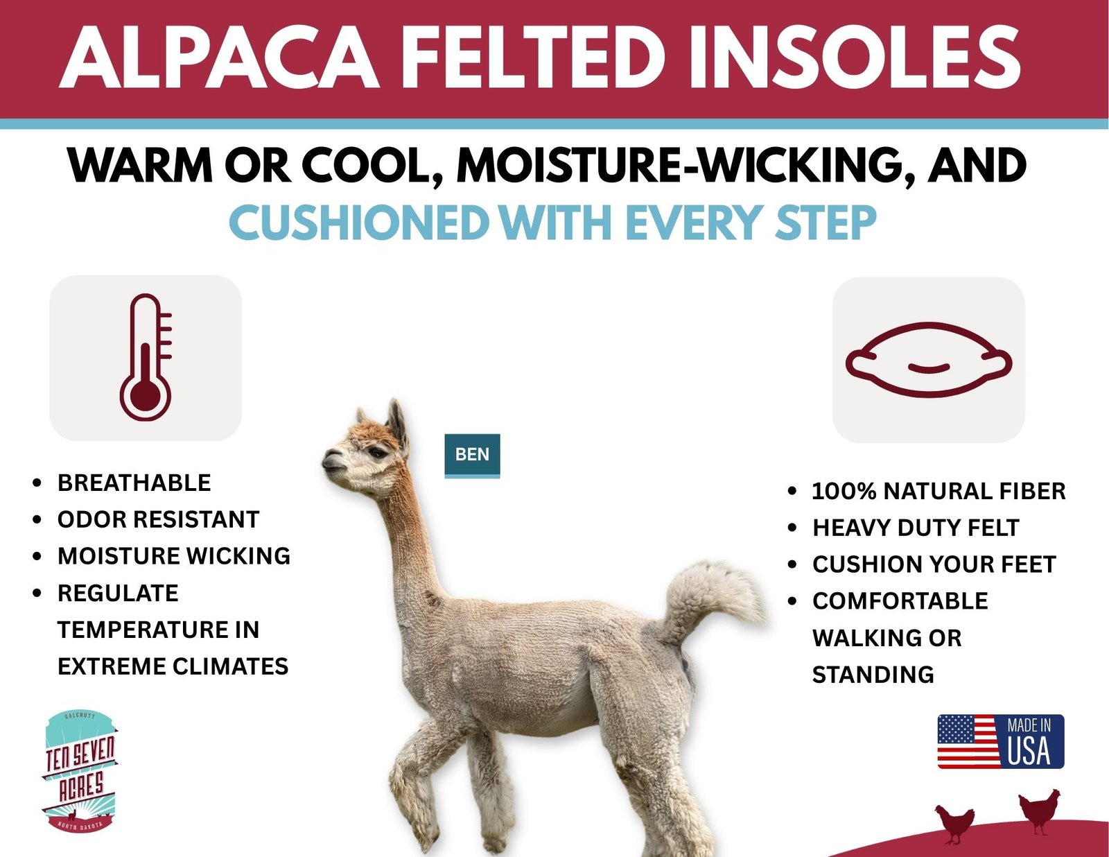Contains 95% Grown in the USA Alpaca and 5% Grown in the USA Merino Wool. Fiber from United States Farms and processed in North Dakota and South Dakota from fiber to felt.