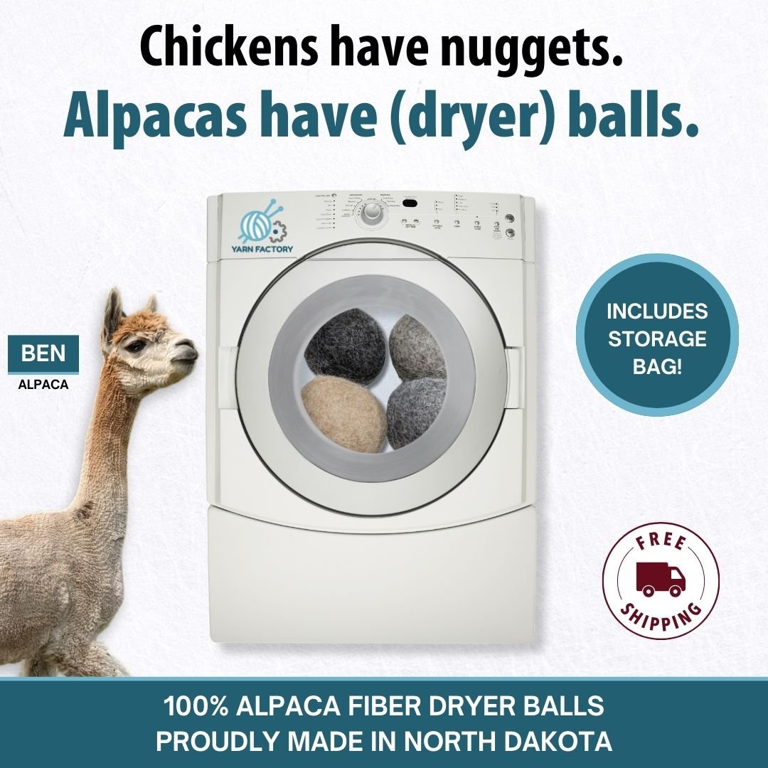 Why alpaca? Alpaca, unlike wool, is considered hypoallergenic and contains no plastics like commercially available plastic dryer balls. Our dryer balls are handmade using locally sourced alpaca fiber from Ten Seven Acres in Galchutt, North Dakota.